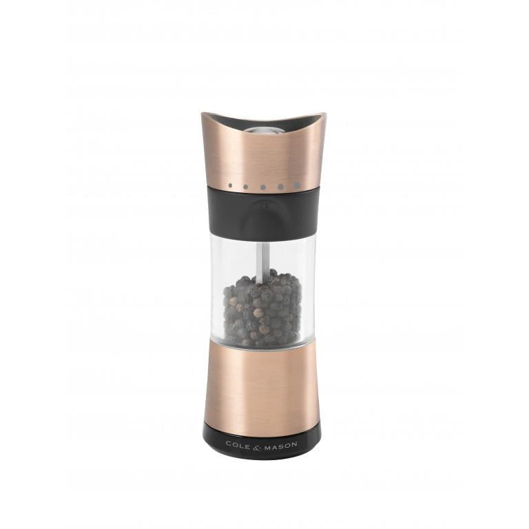 The Cole & Mason Inverta Horsham Copper Pepper Mill features a premium copper finish, modern shape and intuitive design and look great on any table. Easy to use, simply select the how course you want your grind with the selector to choose from 5 pre-selected settings. These award winning Cole & Mason mills feature hardened carbon steel mechanisms. The Cole & Mason Gourmet Precision Mechanism does not crush peppercorns but strips them to consistently release maximum flavour with each turn.
