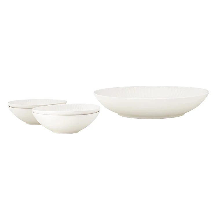 Crafted from durable and elegant white porcelain, this set features a statement serving bowl with four matching pasta bowls ideal for serving or entertaining in any occasion. Wrapped in a compact gift box, each one makes for a perfect housewarming gift or any type of gift for a special one!