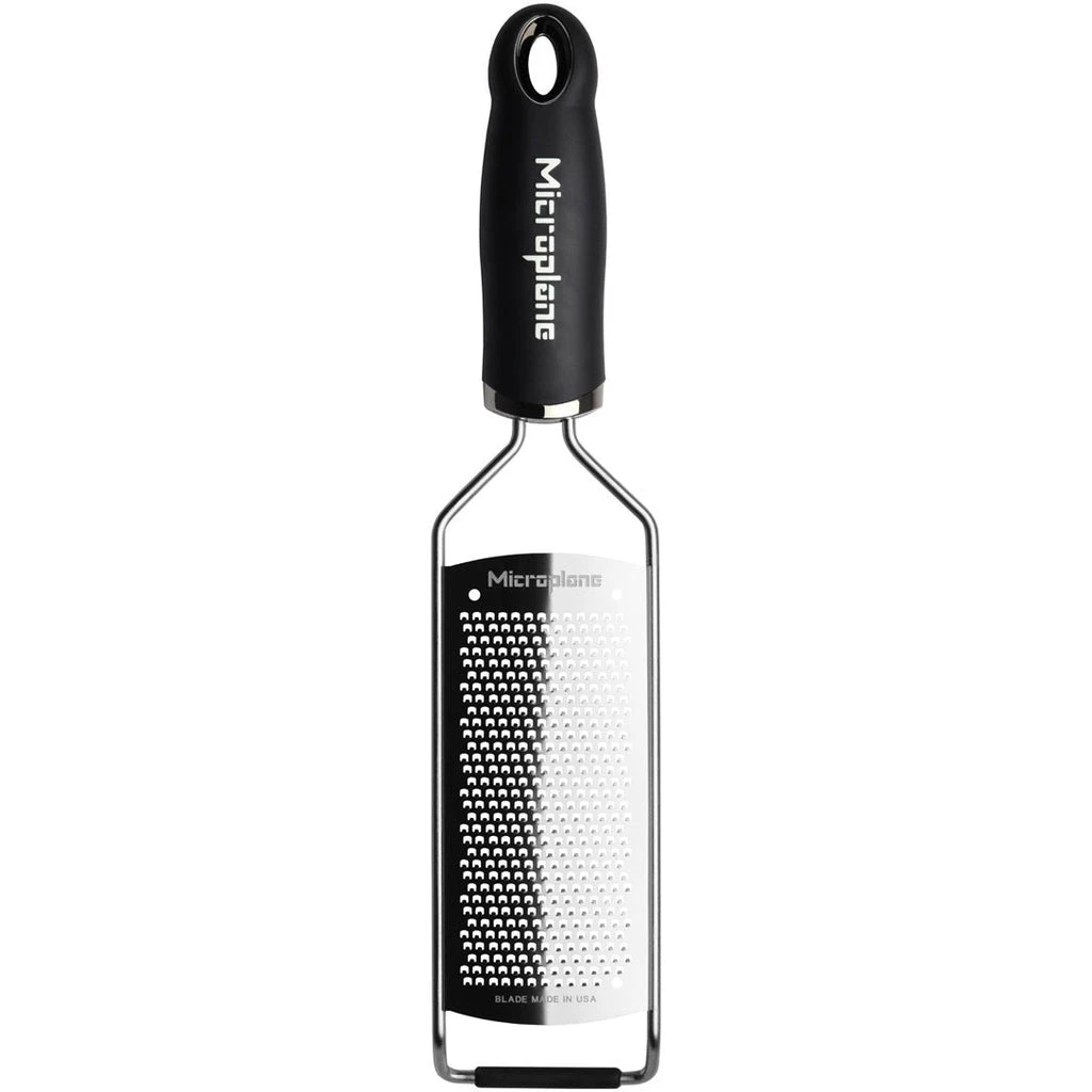 For all your grating and zesting in the kitchen trust the brand chefs use with the Microplane Gourmet Series Fine Grater. The Microplane Gourmet Series of kitchen hand graters features the same clog-resistant stainless steel blade you have come to expect from the Microplane brand and have encoporated a non-slip bar at the base of the kitchen tool for improved leverage.