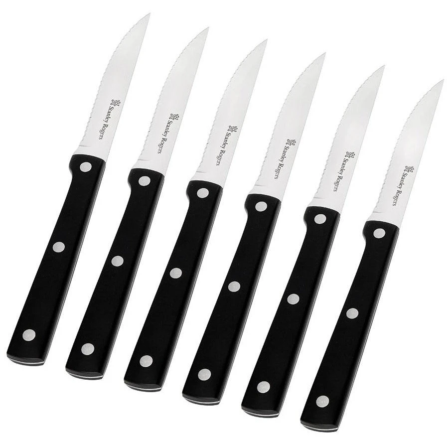 Famous for cutlery you know your Bistro Steak Knives Set of 6 from Stanley Rogers is made to last. Easy-cut serration glides through any steak. The full tang with triple riveted handles feels comfortable to hold and provides lasting strength.
